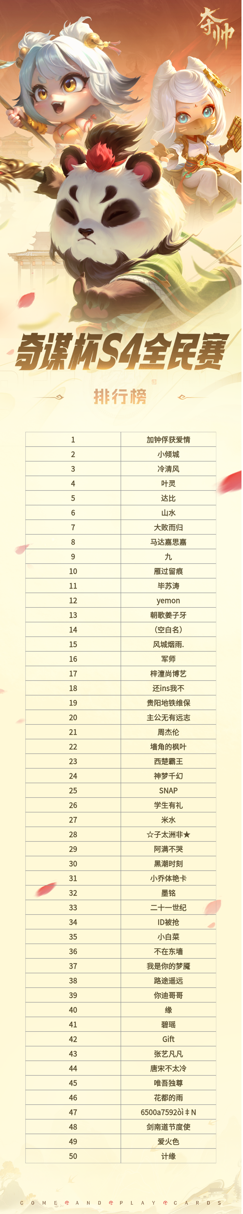 我们现公示《奇谋杯S4》相关榜单的获奖榜单。