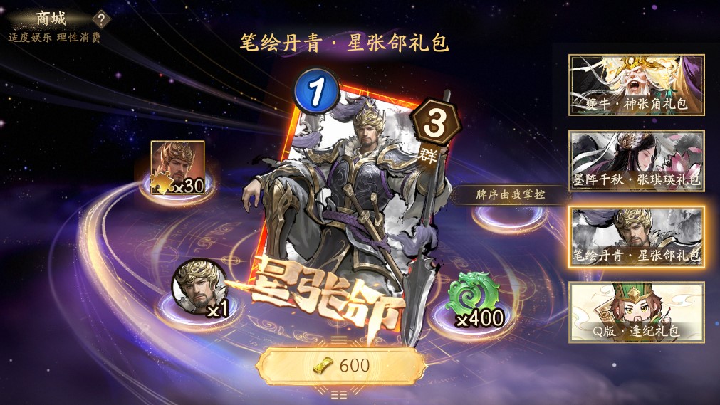 购买后可获得笔绘丹青·星张郃皮肤、笔绘丹青·星张郃头像、星张郃碎片*30、宝玉*400、称号【牌序由我掌控】。