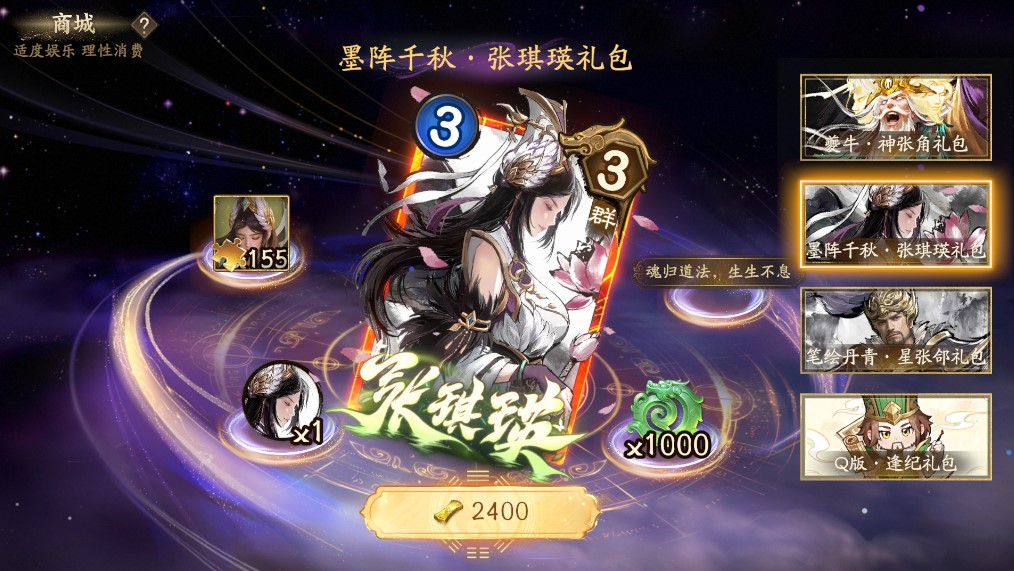购买后可获得墨阵千秋·张琪瑛皮肤、墨阵千秋·张琪瑛头像、张琪瑛碎片*155、宝玉*1000、称号【魂归道法,生生不息】。