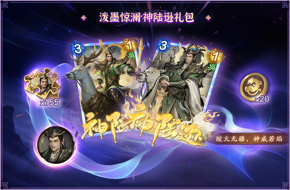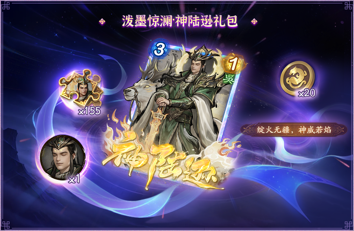 购买后可获得:泼墨惊澜·神陆逊×1、泼墨惊澜·神陆逊头像×1、神陆逊碎片×155、武将币×20、称号:绽火无疆,神威若焰×1、神陆逊×1(未拥有该武将)