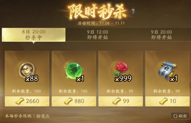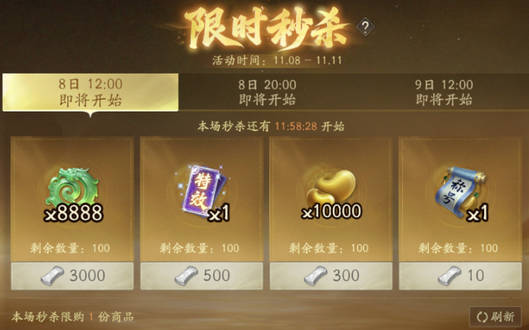 2025年11月8日-2025年11月11日,每日开放两场限时秒杀活动!宝玉、武将币等抄底骨折价,每场秒杀每件商品限100份!(每场秒杀限购1份商品)