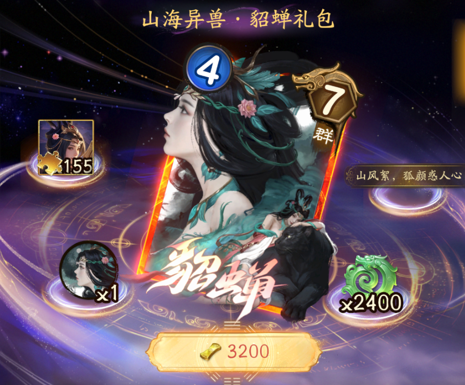购买后可获得山鬼·貂蝉皮肤、山鬼·貂蝉头像、貂蝉碎片*155、宝玉*2400、称号。