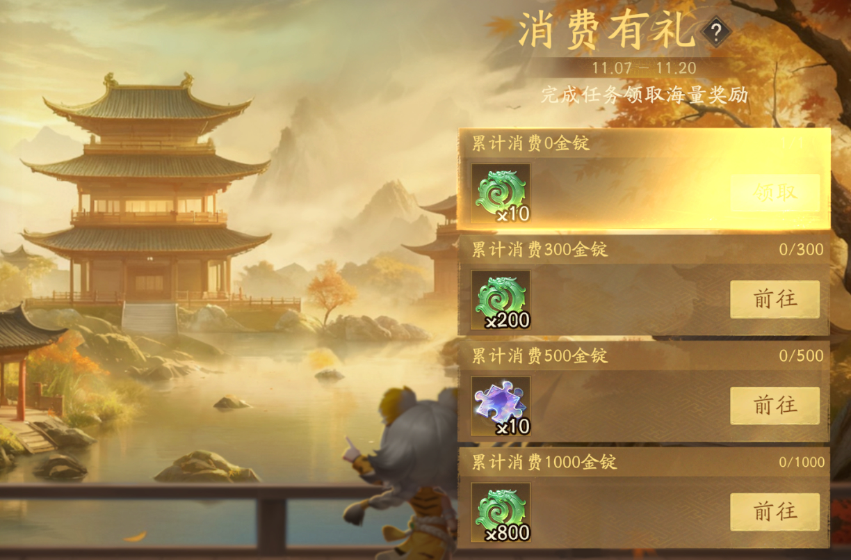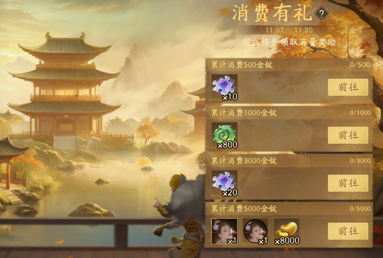 累计消费0/300/500/1000/3000/5000金锭可领取宝玉*10/宝玉*200/万能碎片*10/宝玉*800/万能碎片*20/金粉风华糜夫人+头像+欢乐豆*8000