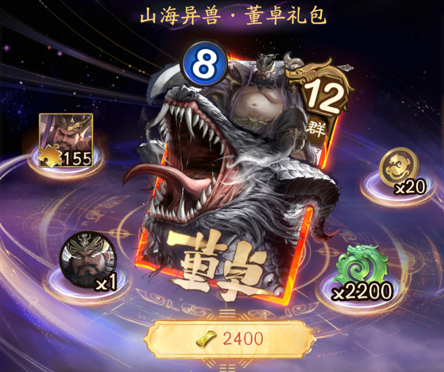 购买后可获得饕餮·董卓皮肤、饕餮·董卓头像、董卓碎片*155、宝玉*2200、武将币*20。