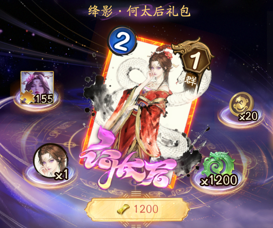 购买后可获得绛影·何太后皮肤、绛影·何太后头像、何太后碎片*155、宝玉*1200、武将币*20。