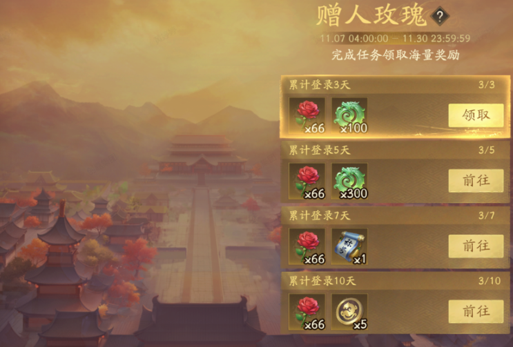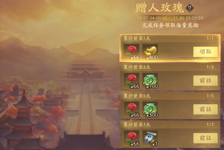 11月7日4:00起登录游戏,累计登录即可领取浪漫的玫瑰福利!