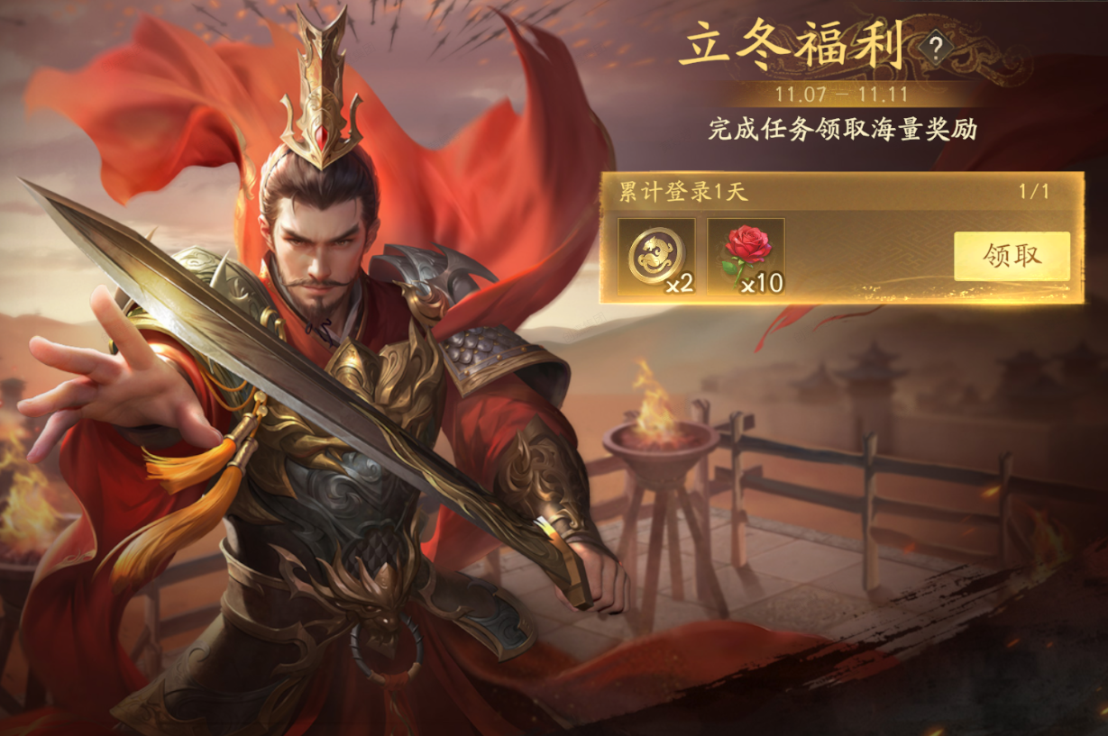 11月7日起登录游戏,即可领取立冬的暖心福利!武将币*2、鲜花*10!(活动期间仅限领取1次)
