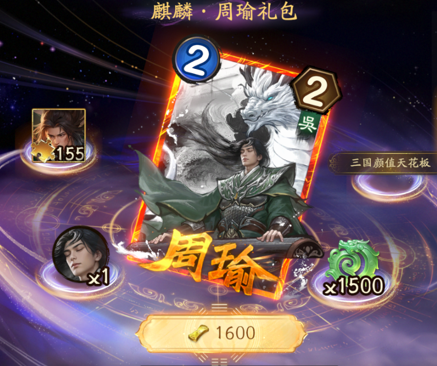购买后可获得麒麟·周瑜皮肤、 麒麟·周瑜头像、周瑜碎片*155、宝玉*1500、称号:三国颜值天花板。