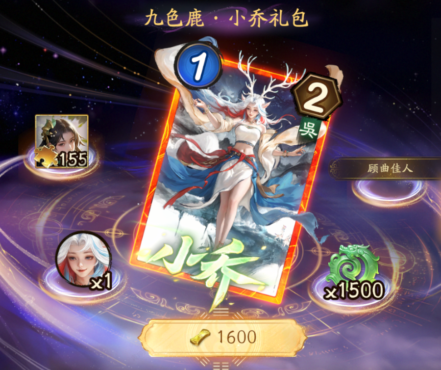 购买后可获得九色鹿·小乔皮肤、九色鹿·小乔头像、小乔碎片*155、宝玉*1500、称号:顾曲佳人。