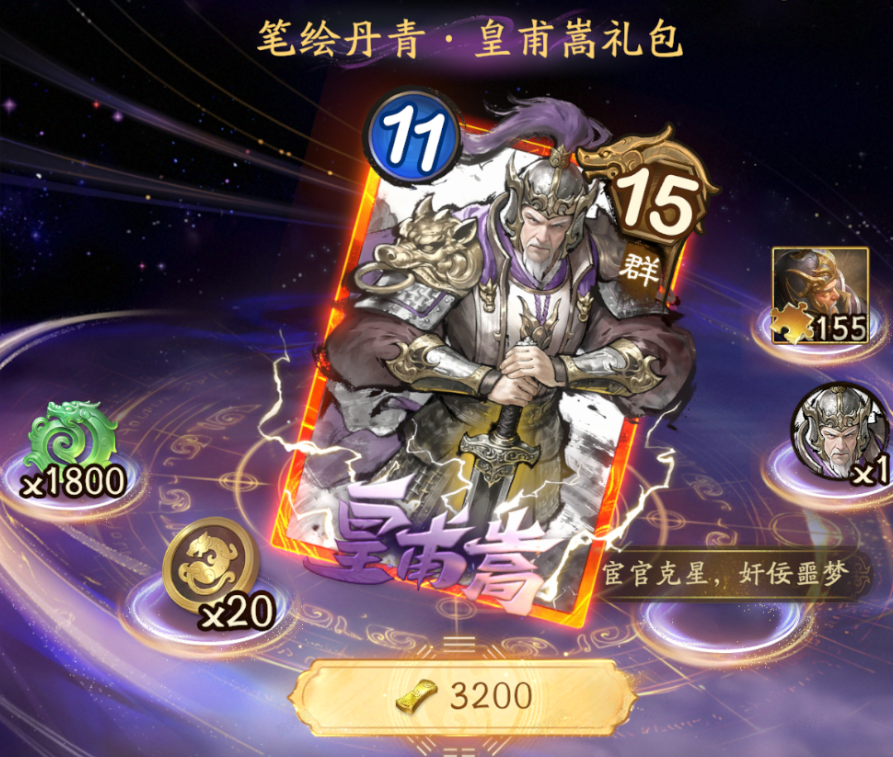 购买后可获得笔绘丹青·皇甫嵩皮肤、笔绘丹青·皇甫嵩头像、皇甫嵩碎片*155、宝玉*1800、称号:宦官克星,奸佞噩梦、武将币*20。