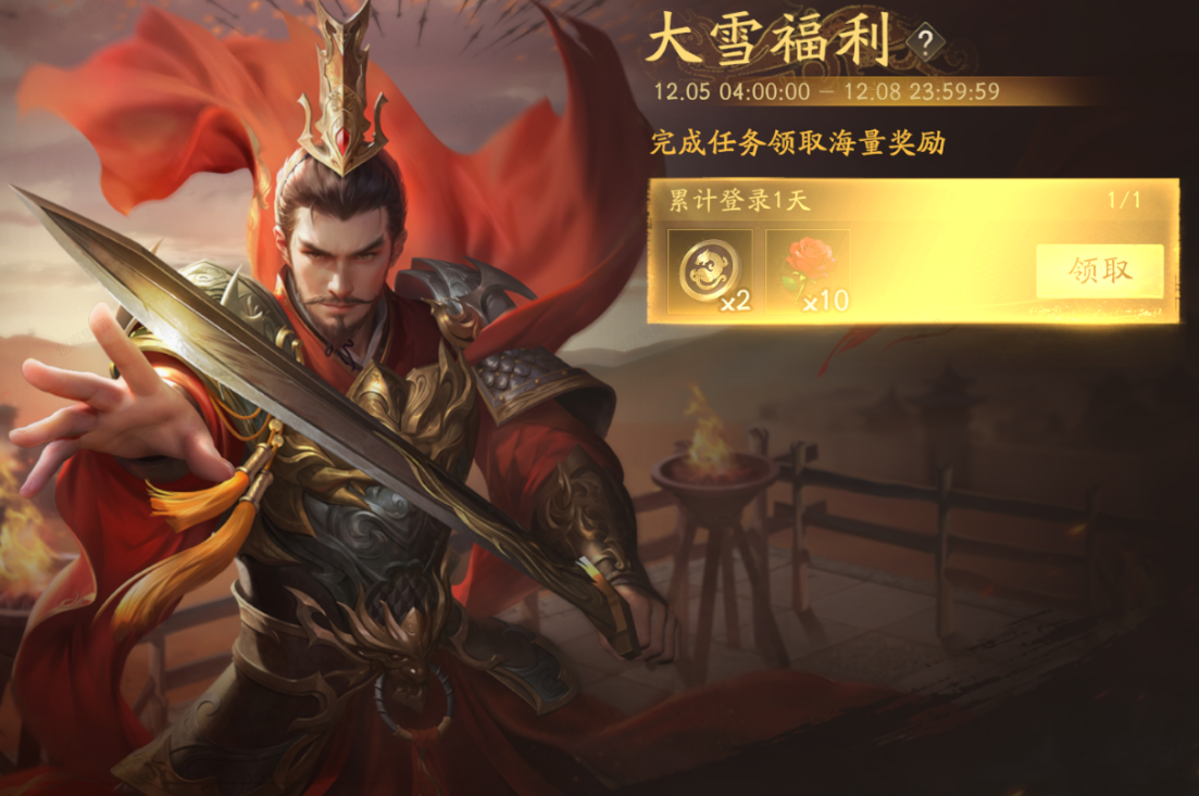 12月5日4:00-12月8日23:59:59,活动期间前往活动页面即可领取大雪福利礼包~(活动期间限领1次)