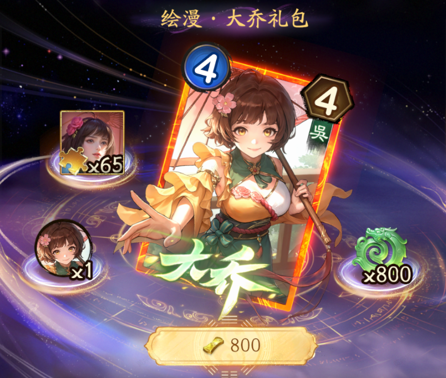 购买后可获得绘漫·大乔皮肤、绘漫·大乔头像、大乔碎片*65、宝玉*800。