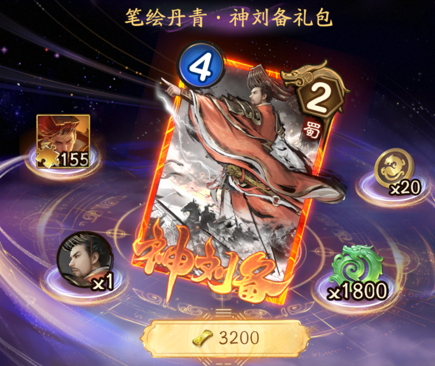 购买后可获得笔绘丹青·神刘备皮肤、 笔绘丹青·神刘备头像、神刘备碎片*155、宝玉*1800、武将币*20。