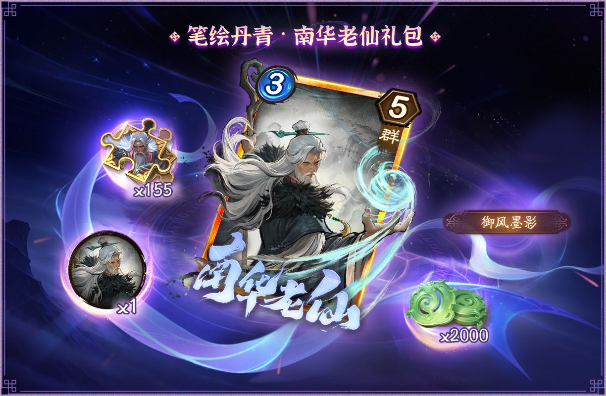 购买后可获得:笔绘丹青·南华老仙皮肤、笔绘丹青·南华老仙头像、南华老仙碎片*155、宝玉*2000、称号:御风墨影