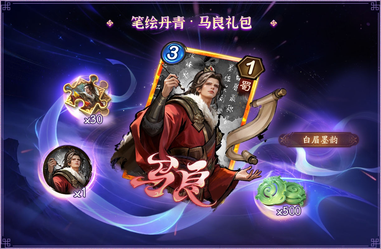 购买后可获得:笔绘丹青·马良皮肤、笔绘丹青·马良头像、马良碎片*30、宝玉*500、称号:白眉墨韵