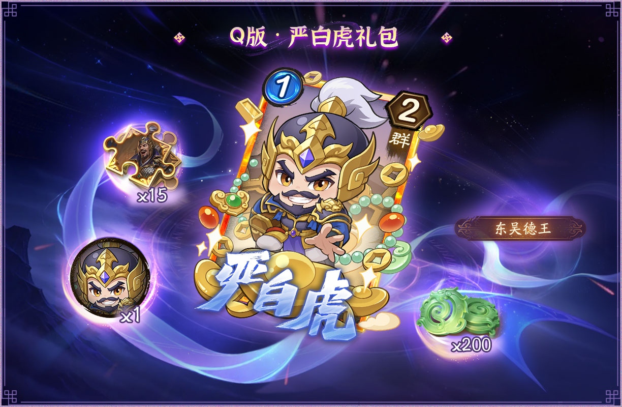 购买后可获得:Q版·严白虎皮肤、Q版·严白虎头像、严白虎碎片*15、宝玉*200、称号:东吴德王